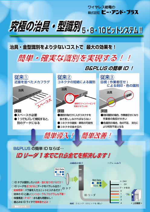簡単・確実な識別を実現する!!B&PLUS の簡単ID !◆IDタグは識別したい治具・型に貼り付けるだけ! ◆IDリーダを近づけるとデータをパラレル出力! ◆配線簡単!ハ...