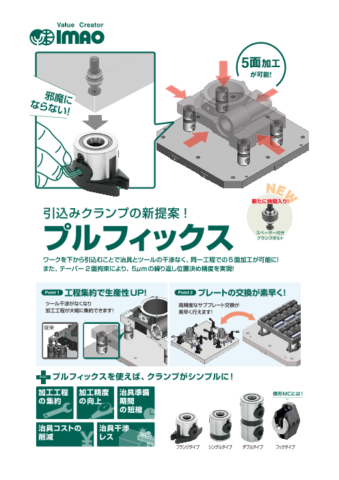ツール干渉がないシリンダー形状で、ワークの下から引込むことにより、5面加工を実現!また、テーパー2面拘束により、5μmの繰り返し位置決め精度を実現!■加工工程の集約■加工...
