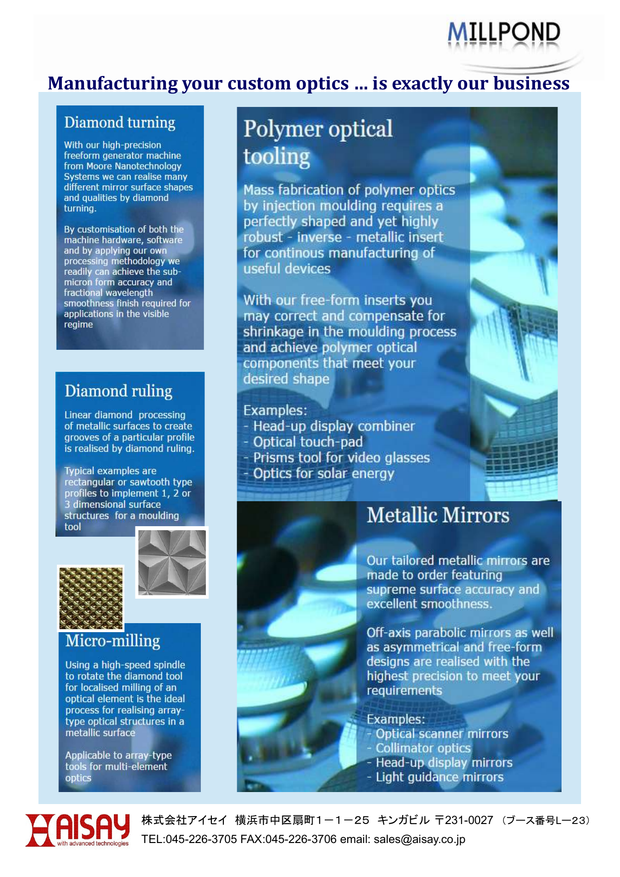 Manufacturing your custom optics ... is exactly our businessMIllpond社は、大幅にカスタマイズされた制御系により自動化された高精度ダイヤモンド切削加工機によって、研磨工程をなしでも良好な光学面を持つリーズナブルな自由曲面三次元ミラーや高精度金型,...