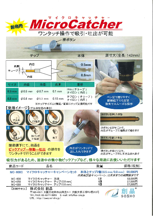 ◆ペン型で握りやすく顕微鏡下でも安定◆指先でスムーズな操作◆押しボタンを押すことで、内芯がチューブ先端部まで動きます◆詳細はカタログをダウンロードしてご覧下さい。