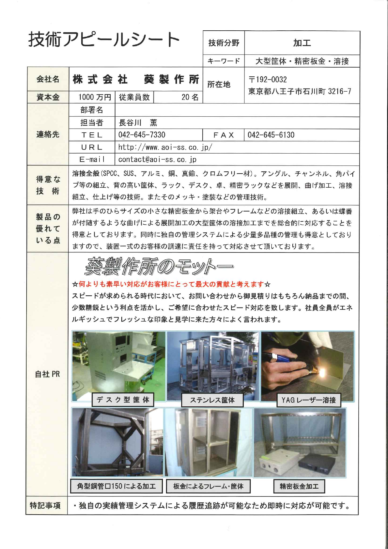 【得意な技術】溶接全般(SPCC、SUS、アルミ、銅、真鍮、クロムフリー材)。アングル、チャンネル、角パイプ等の組立、背の高い筐体、ラック、デスク、卓、精密ラックなど...