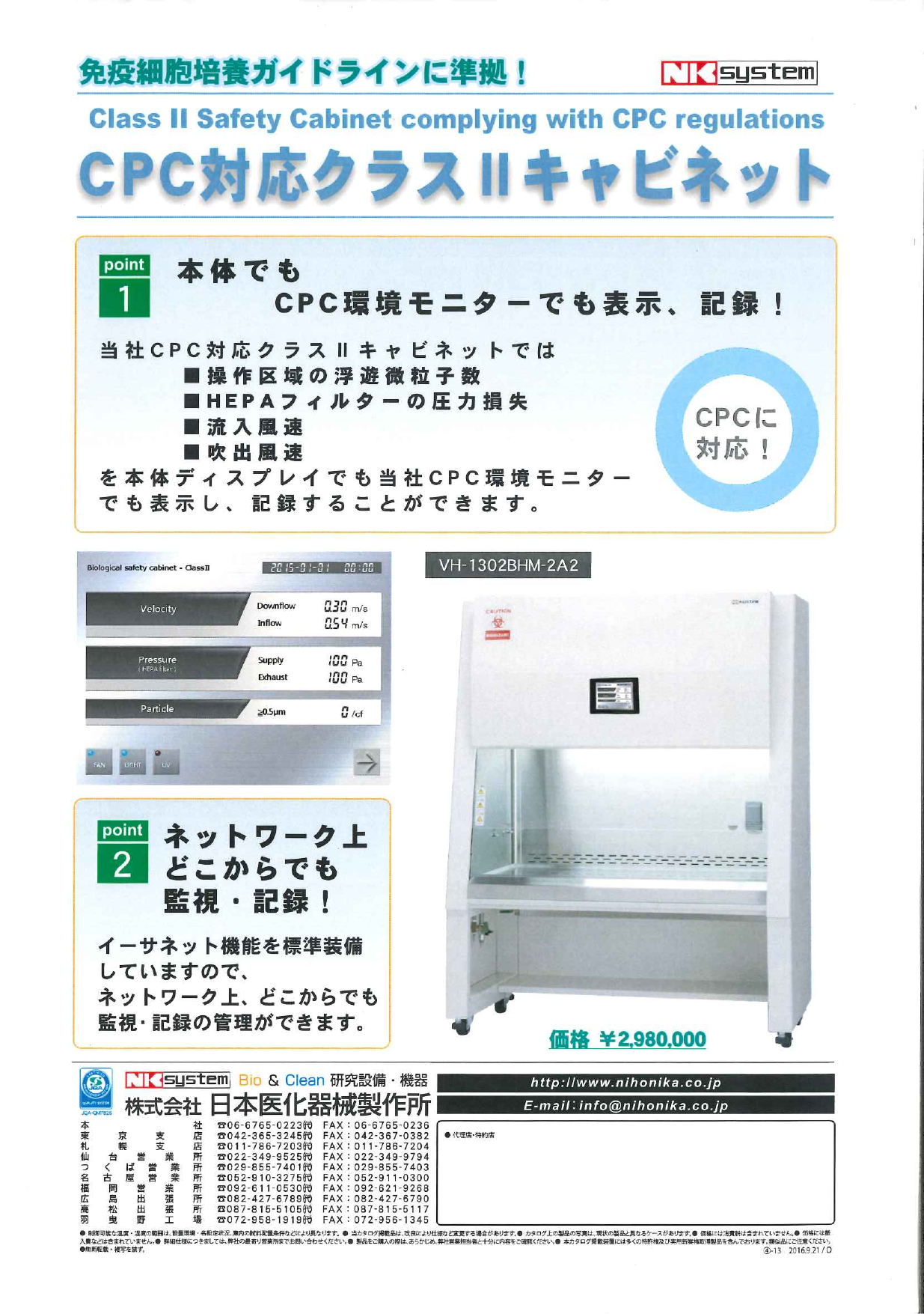 免疫細胞培養ガイドラインに準拠!本体でもCPC環境モニターでも表示、記録当社CPC対応クラスIIキャビネ ットでは■操作区域の浮遊微粒子数■HEPAフィルターの圧力損失■...
