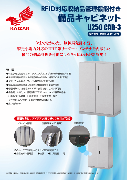 今までになかった、無線局免許不要、特定小電力対応のUHF帯リーダー・アンテナを内蔵した備品の個品管理を可能にしたキャビネットが新登場◆特定小電力対応のため、ランニン...