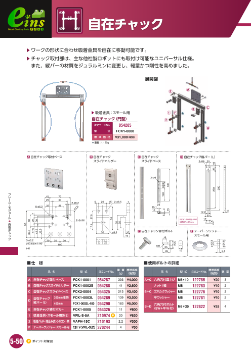 ・ワークの形状に合わせ吸着金具を自在に移動可能です。・チャック取付部は、主な他社製ロボットにも取付け可能なユニバーサル仕様。また、縦バーの材質をジュラルミンに変...