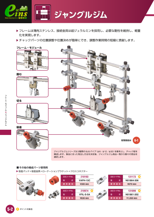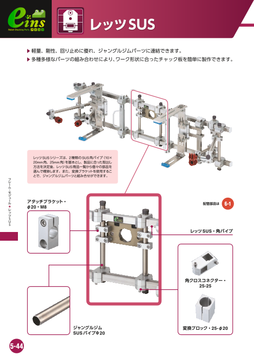 ・軽量、剛性、回り止めに優れ、ジャングルジムパーツに連結できます。・多種多様なパーツの組み合わせにより、ワーク形状に合ったチャック板を簡単に製作できます。