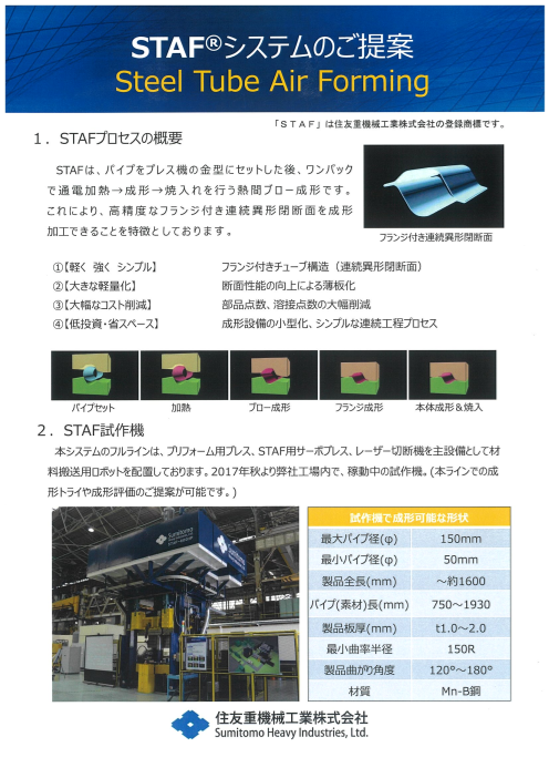 住友重機械工業が開発した、1500Mpa級のパイプ材を使用した熱間エアフォーミング、フランジ成形が可能となり今までの構造体より少部品化出来る為、型冶具費の削減、加工費などラ...