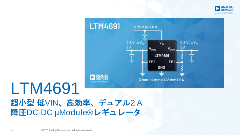 ◆小型表面実装で薄型の3 × 4 × 1.18mm LGAパッケージ◆入力電圧範囲:2.25V~3.6V◆デュアル2A DC出力電流◆±1.5%全出力電圧レギュレーション◆電流モード制御、高速過渡応...