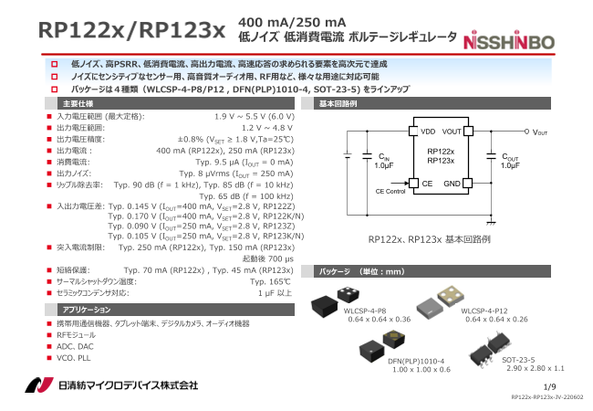 ・ノイズにセンシティブなセンサー用、高音質オーディオ用、RF用など、様々な用途に対応可能・パッケージは4種類(WLCSP-4-P8/P12 , DFN(PLP)1010-4, SOT-23-5) をラインアッ...