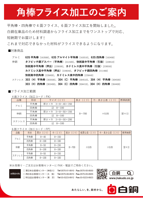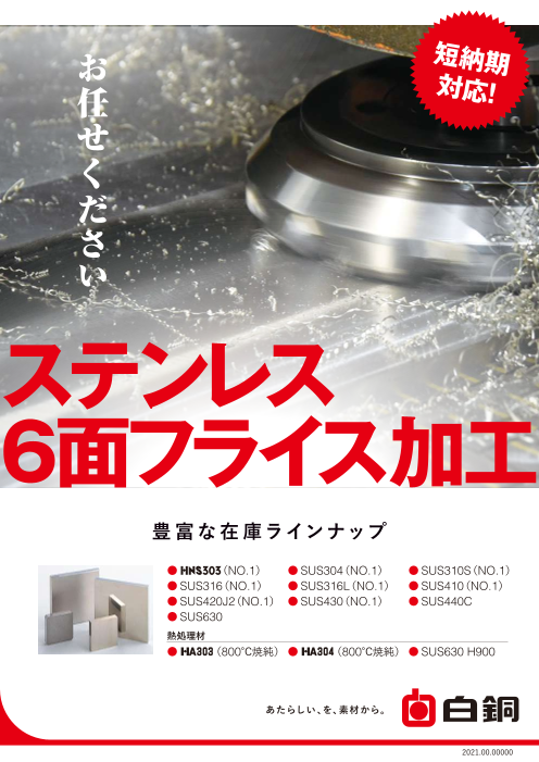 ステンレス6面フライス加工豊富な在庫ラインナップ・HNS303(NO.1)・SUS304(NO.1)・SUS310S(NO.1)・SUS316(NO.1)・SUS316L(NO.1)・SUS410(NO.1)・SUS420J2(NO.1)・SUS430(NO.1)・SUS440C・SUS630熱処理材・HA303(800℃焼鈍)...