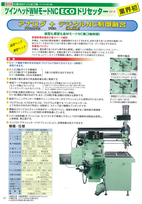 業界初! ツインヘッドWMモードNCドリセッター 縦方向+横方向のドリル・タップ加工1台の機械で可能です。NC自動運転とマニュアル操作も可能な複合型小型工作機械です!