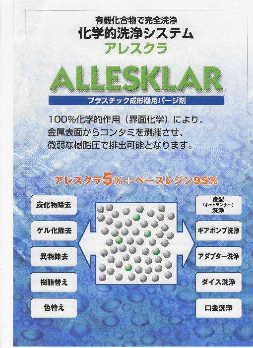 100%科学的作用(界面科学)により、金属表面からコンタミを剥離させ、微弱な樹脂圧で排出可能。スクリューにアレスクラを使用した洗浄前後の比較写真有り!●製品特長...