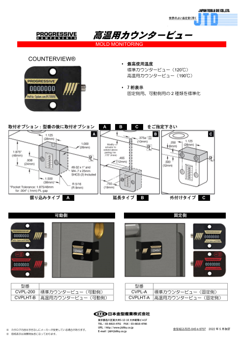 金型温度190℃まで対応可能なカウンタービュー。シンプルで見易い7桁表示で金型のショット数を正確に把握する。従来の稼働側設置に加えて固定側に設置するタイプも標準化。金型掘り込みタイプ、金型外付けタイプを選択可能。