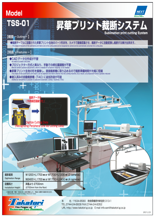 『TSS-01』は、TAC独自の優れたハードウェアと充実したCAMソフトが、各種CADデータを最大限に活用し、高速・高精度・高能率の自動裁断を実現します。また、簡単な自動裁...