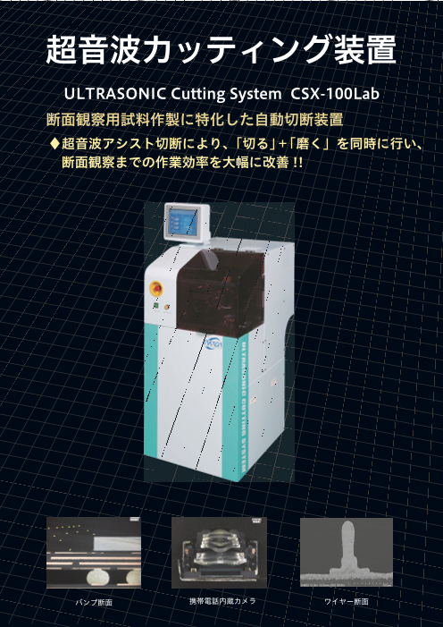 断面観察用試料作製に特化した切断装置です。超音波カッティングの切断面研磨効果(Polis Cut)を利用し、「切る」「磨く」の工程を1つにすることで断面観察作業の省力化/時...