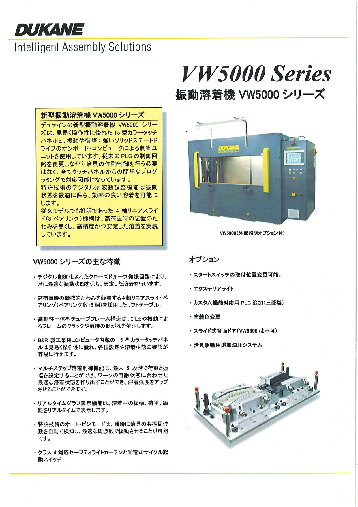 振動溶着機 VW500シリーズの製品カタログです。各種のプラスチック溶着機が存在しておりますが、形状、材質、仕様によって最適な溶着工法を選択致します。一般的には超音波...