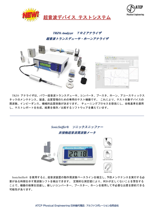 掲載製品◆TRZ(R)アナライザ 超音波トランス・ホーンアナライザ◆ソニックスニッファー 非接触超音波周波数メータ◆ピエゾクランピング◆ソネラスティック ◆詳細はカタ...