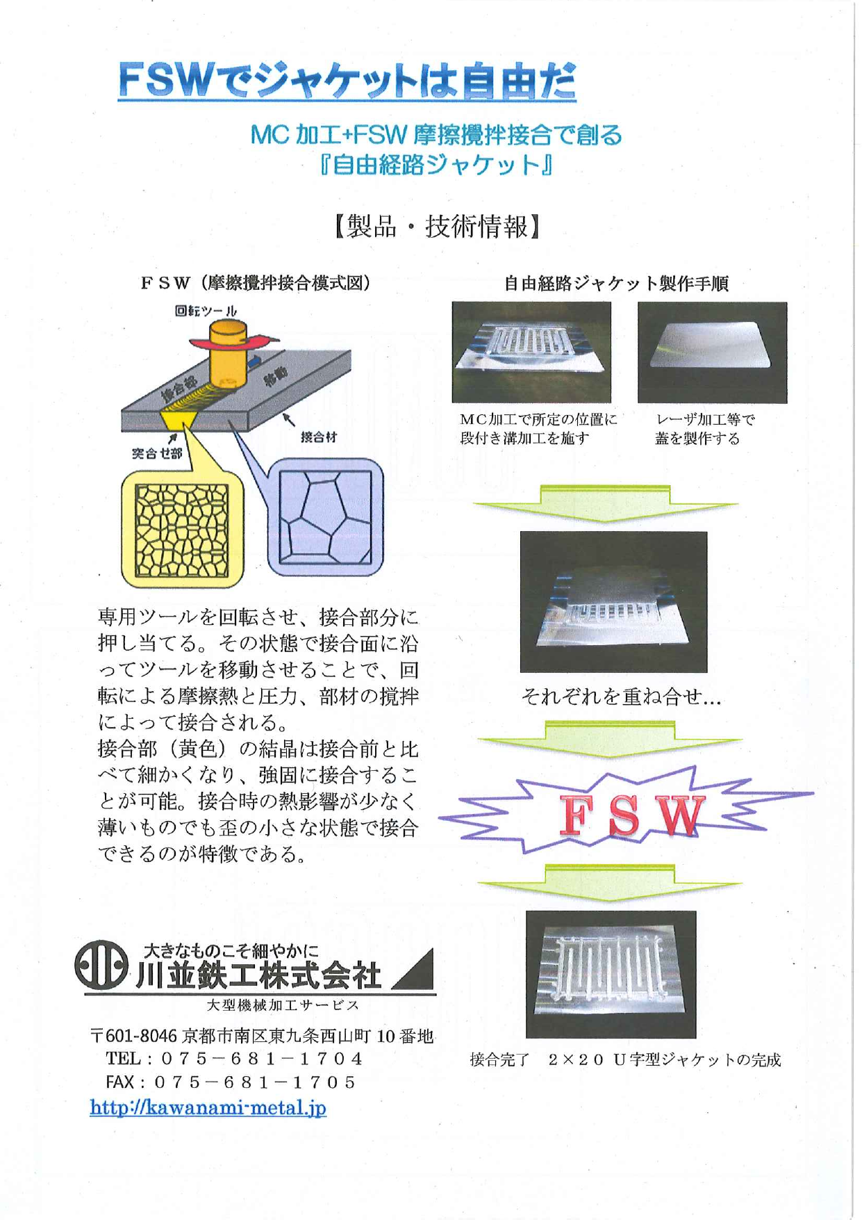 ・MC加工+FSW摩擦攪拌接合で創る「自由経路ジャケット」。・マシニングプロジェクト!大型機械加工の川並鉄工。【川並鉄工の加工品】・大物高精度ベース板加工・鋳物...