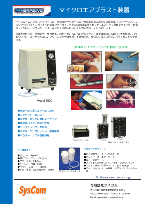 マイクロ・エアブラストシリーズは、高精度のパウダーフロー制御と用途に合わせた豊富なパウダーやノズルによりラボからラインまで多くの実績があります。モデル6500は電源不要...