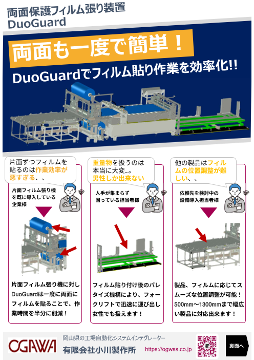 ◆幅広い対応力と両面同時フィルム貼りで作業効率を最大◆パレタイジングまで自動化したワンストップソリューション◆使いやすさを追求した設計で、誰でも簡単操作◆詳細は...
