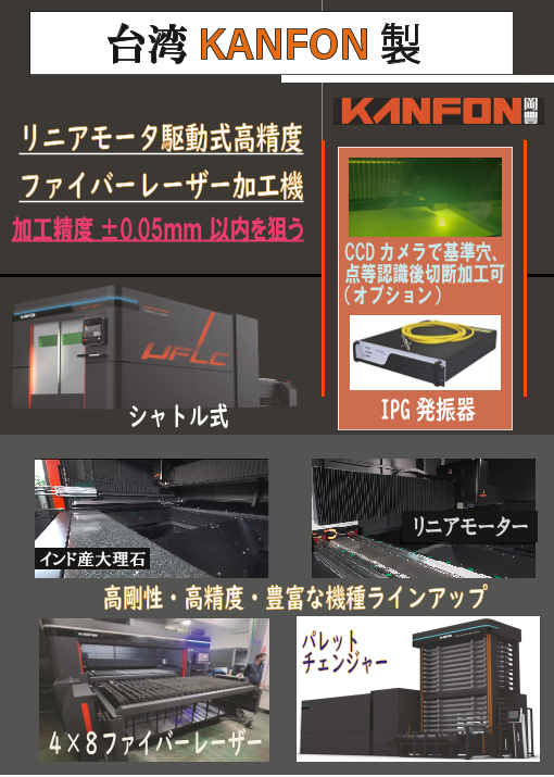 μFLC 台湾KANFON製 高精度加工機種ラインアップのご紹介です。◼︎タレットパンチプレスとの複合加工可◼︎単体機・シャトル式・テーブル手動引出式有り◼︎レーザーの他...