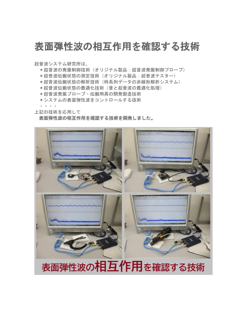 超音波システム研究所は、 *超音波の発振制御技術(オリジナル製品:超音波発振制御プローブ) *超音波伝搬状態の測定技術(オリジナル製品:超音波テスター) *超...