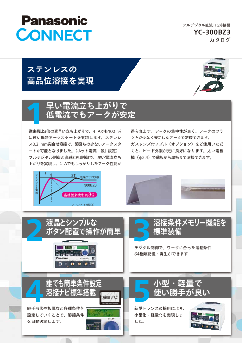 ◆早い電流立ち上がりで低電流でもアークが安定◆液晶とシンプルなボタン配置で操作が簡単◆溶接条件メモリー機能を 標準装備◆誰でも簡単条件設定溶接ナビ標準搭載◆小型・...