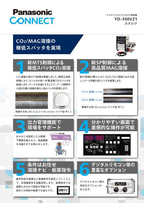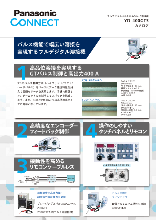 ◆MTS-CO2溶接法による低スパッタの実現◆SP-MAG溶接による低スパッタ&高品質の実現◆HD-Pulse溶接による入熱低減&低スパッタの実現◆操作性にこだわったコントローラー...