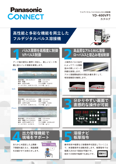◆パルス周期を高精度に制御VPパルス制御◆高品質なアルミMIG溶接ローパルスと溶込み増加制御◆分かりやすい画面で 直感的な操作が可能◆出力管理機能で現場をサポート◆溶接...