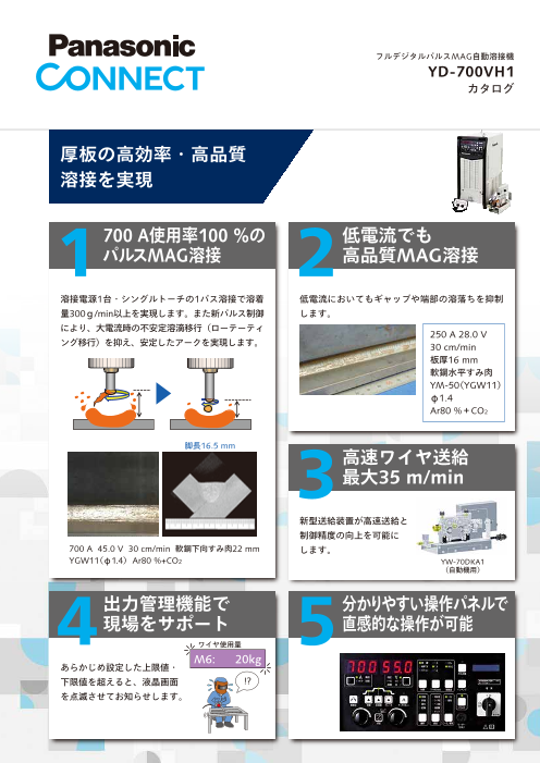 ◆700 A使用率100 %のパルスMAG溶接◆低電流でも高品質MAG溶接◆高速ワイヤ送給最大35 m/min◆出力管理機能で現場をサポート◆分かりやすい操作パネルで直感的な操作が可能...