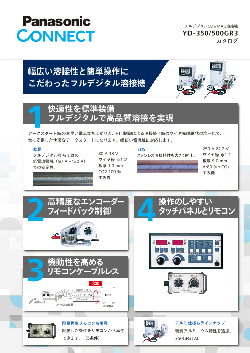 ◆溶接性能・軟銅 100 kHzインバータにより、YD-350VZ1よりも更に低スパッタ化に成功しました。・アルミ溶接中のアーク長安定化制御を強化し、スパッタの付着がさらに減...