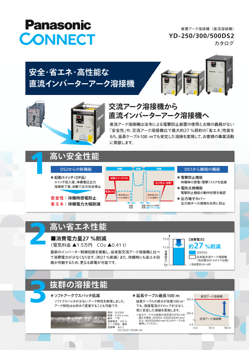 交流アーク溶接機から直流インバーターアーク溶接機へ直流アーク溶接機は法令による電撃防止装置の使用と点検の義務がない「安全性」や、交流アーク溶接機比で最大約27 %節...