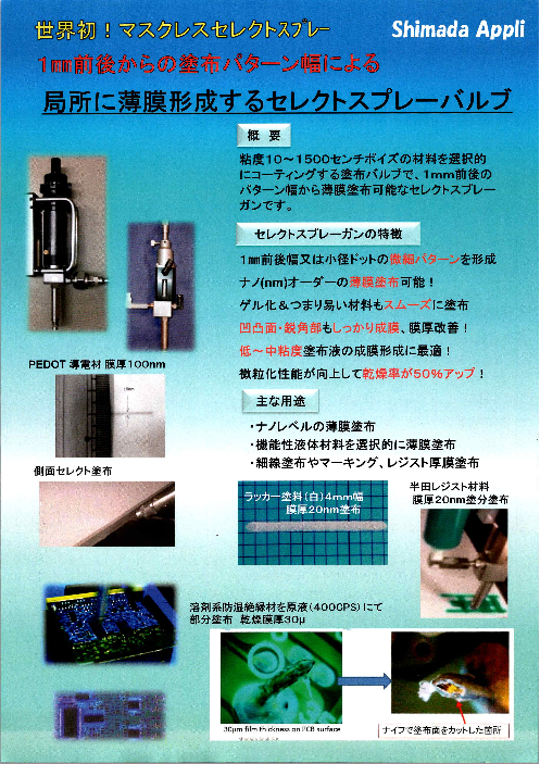 ◆概要 粘度10~1500センチポイズの材料を選択的にコーティングする塗布バルブで、1mm前後のパターン幅から薄膜塗布可能なセレクトスプレーガンです。◆セレクトスプレーガン...