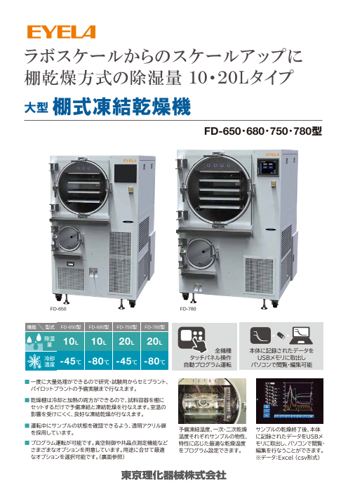 真空凍結乾燥装置について簡単に紹介しています。4~30L機器まで仕様表が載っています。他社製には無い、真空ブロワ機能についても記載があります。