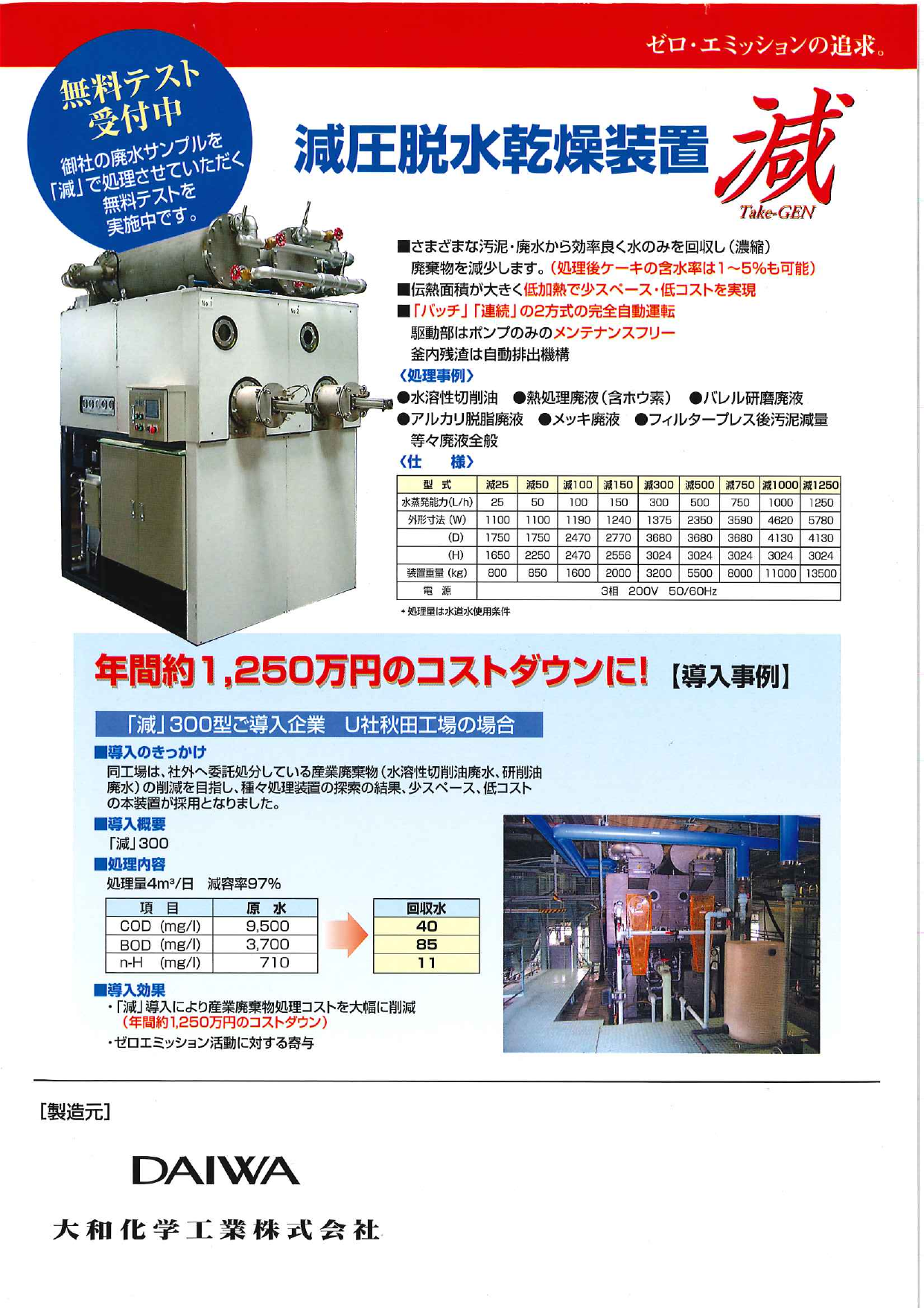 減圧脱水乾燥装置「Take-減」は、こうした産業廃棄物を減量化し、主成分の濃縮や有価物の回収による資源の再利用ができるようにする装置です。 本製品は、減圧蒸留法を核と...