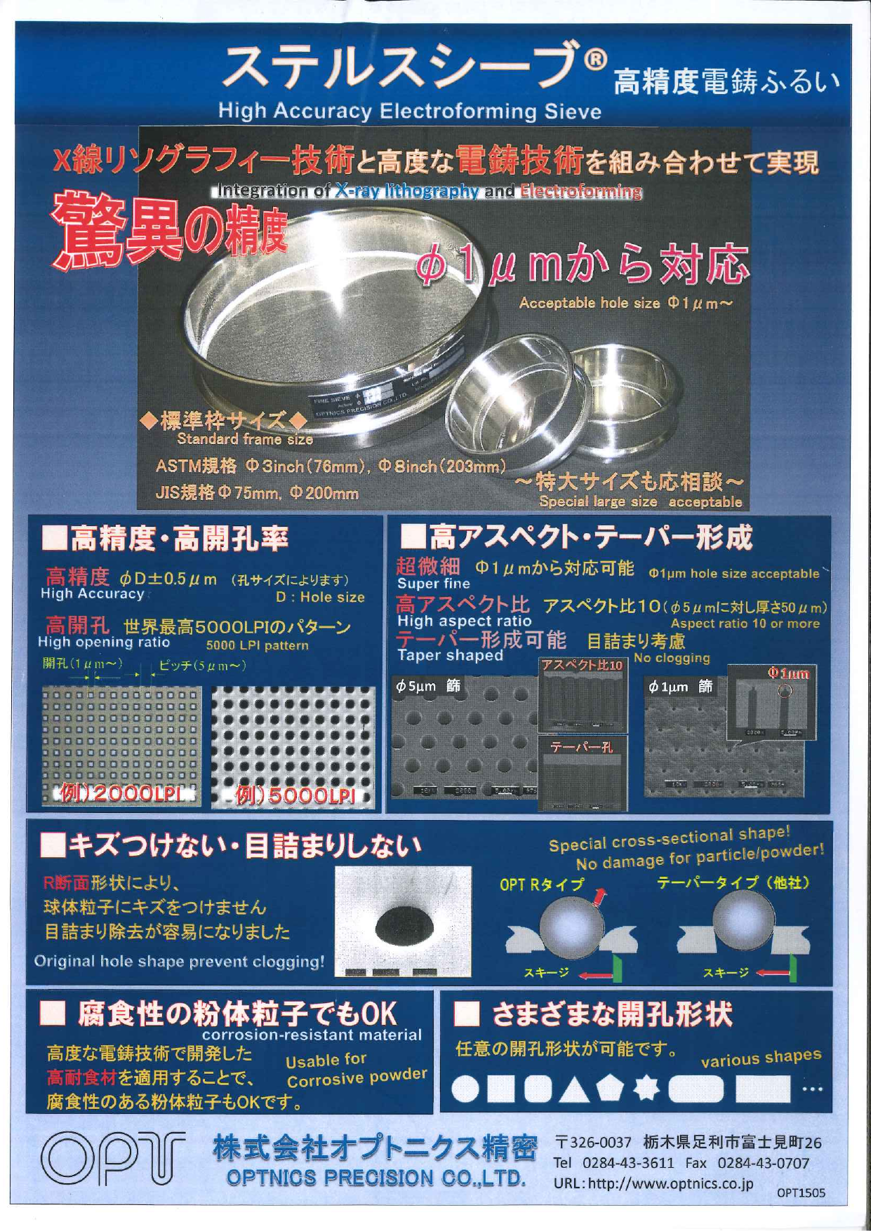 高精度・高開孔率高アスペクト・テーパー形成キズつけない・目詰まりしない腐食性の粉体粒子でもOKさまざまな開孔形状