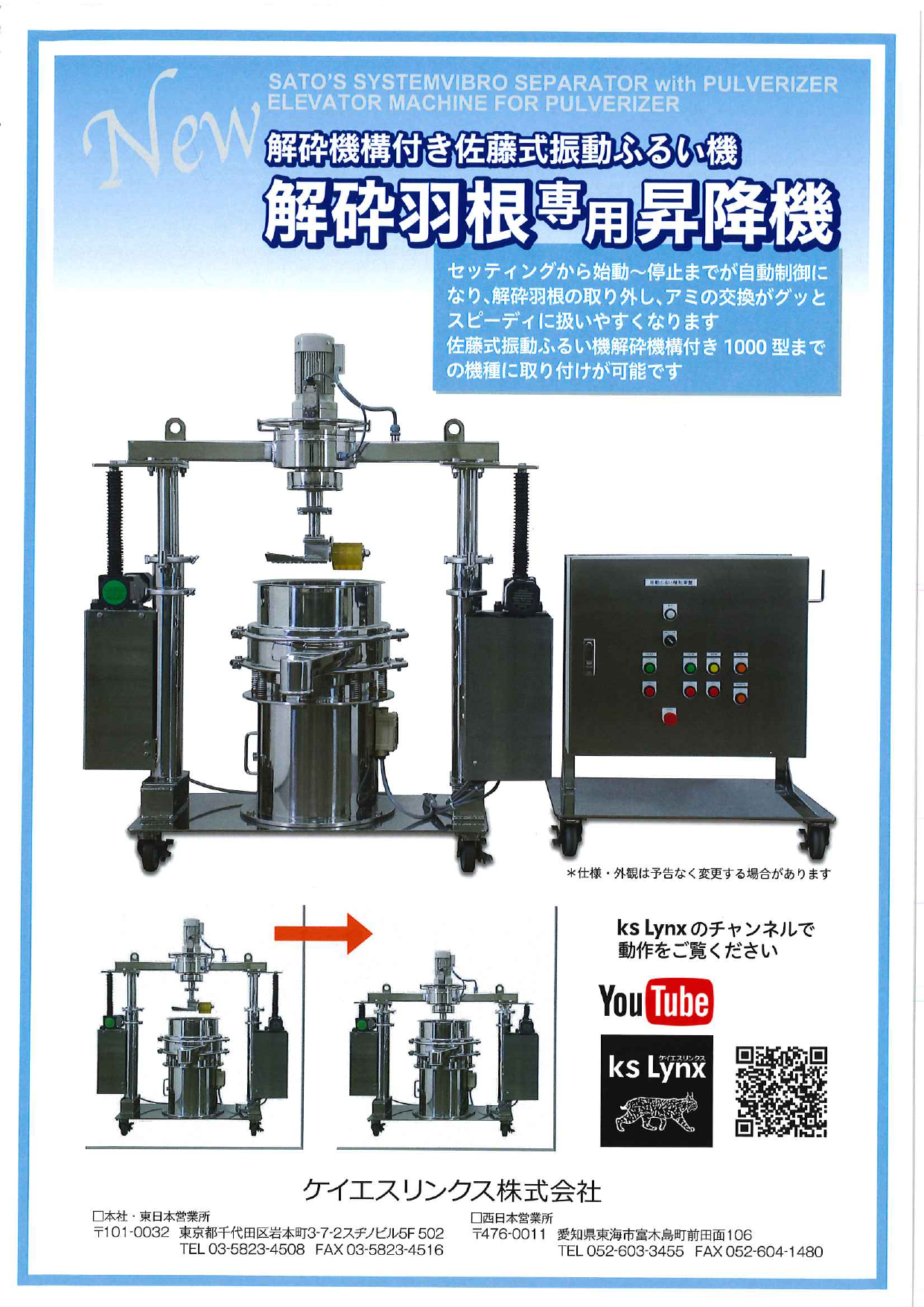 解砕機構付き佐藤式振動ふるい機 解砕羽根専用昇降機 カタログのご案内です。