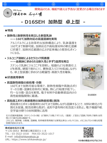 ■特⾧・石川式撹拌擂潰機の基本性能はそのままで、加熱機能を有する。・卓上型で、かつステンレス筐体を採用しているため、実験室やクリーンルームでの使用に最適。・ステ...