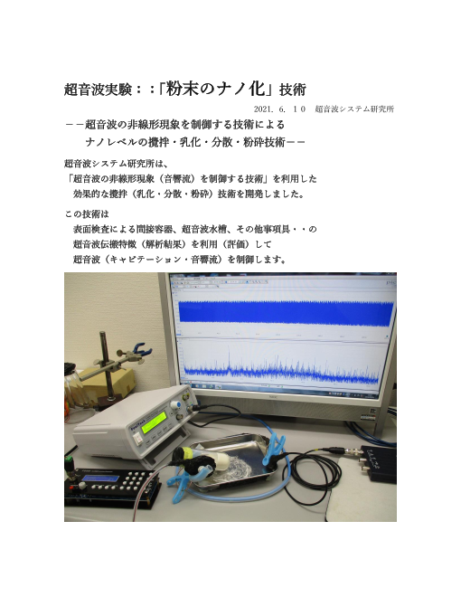 --超音波の非線形現象を制御する技術による ナノレベルの攪拌・乳化・分散・粉砕技術--超音波システム研究所は、「超音波の非線形現象(音響流)を制御する技術」...