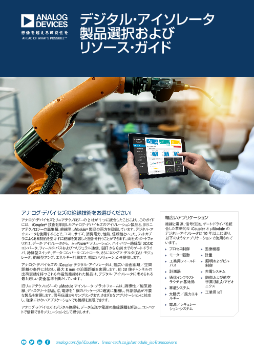 【アナログ・デバイセズの絶縁技術をお選びください!】アナログ・デバイセズとリニアテクノロジーの2社が1つに統合したことにより、このガイドには、iCoupler(R)技術を採用し...