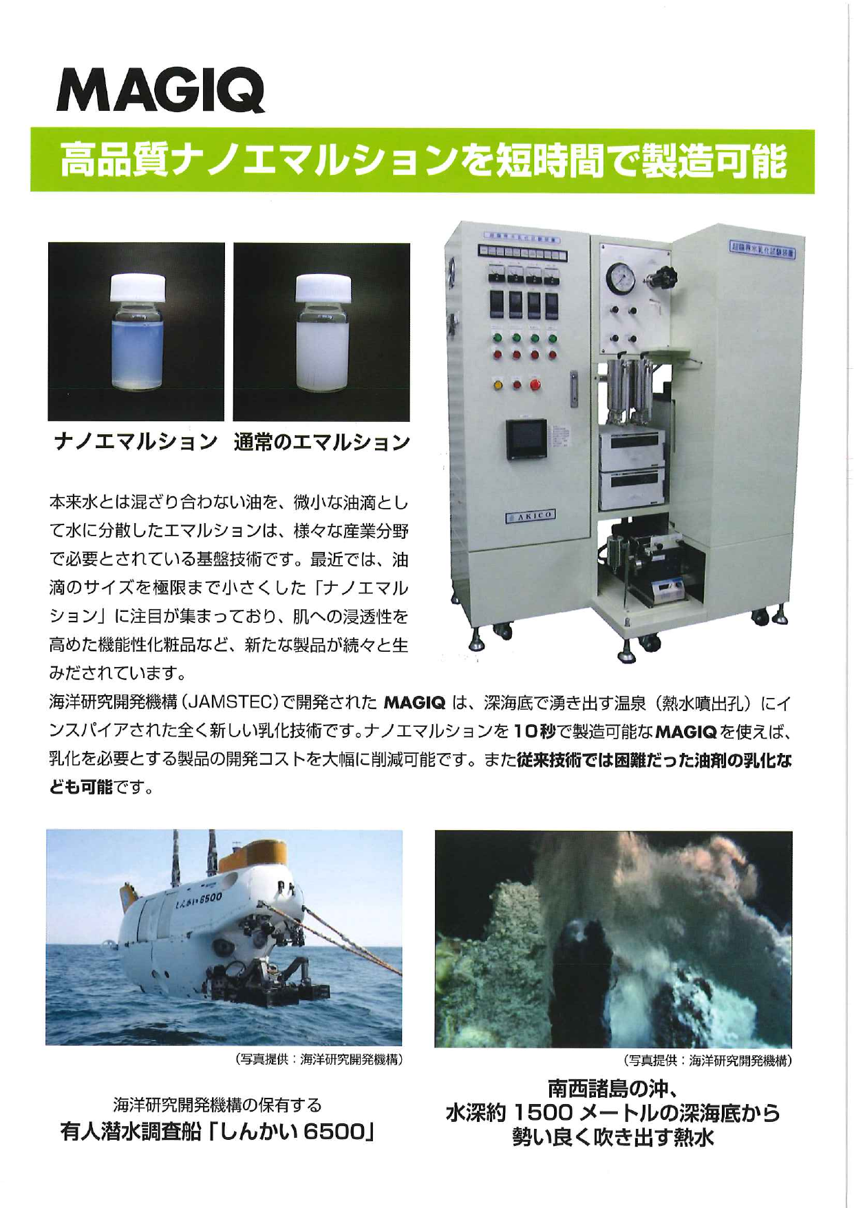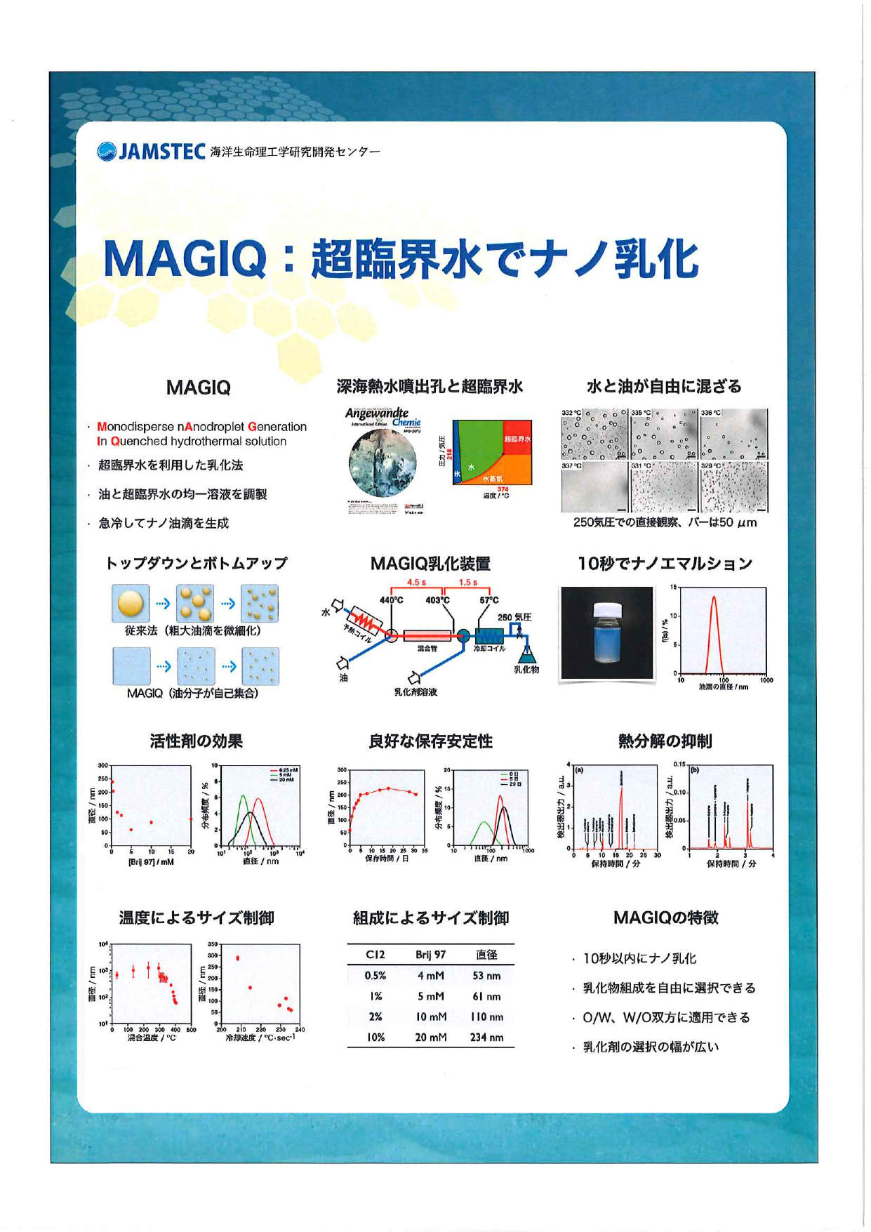 深海熱水噴出孔のような高温・高圧の極限環境では、水の性質すらも大きく変化し、油と自由に混ざり合うようになります。MAGIQは、こうした超臨界水の持つ特異な性質を利用し、水...