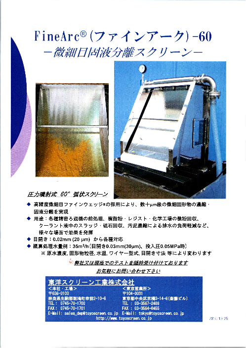 ◆高精度微細目ファインウエッジ(R)の採用により、数十μm級の微細固形物の濃縮・固液分離を実現◆用途:各種精密ろ過機の前処理、樹脂粉・レジス卜・化学工場の微粉回収、クーラ...
