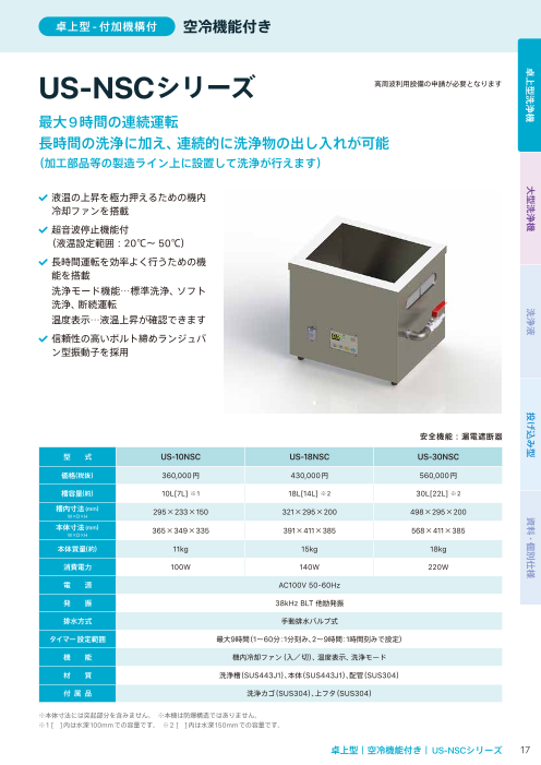 ◆洗浄液を冷却することにより、比較的安定した温度での洗浄が可能◆超音波発振は、高い洗浄力のあるボルト締めランジュバン型振動子を採用◆接液部は、耐食性に優れたステンレ...