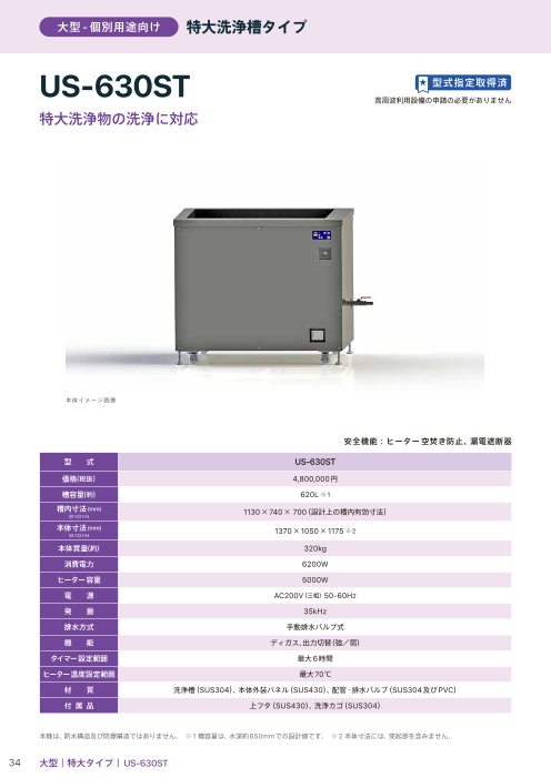 ◆型 式 US-630ST◆槽容量(約) 620L◆槽内寸法(mm) W×D×H 1130×740× 700(設計上の槽内有効寸法)◆本体寸法(mm) W×D×H 1370×1050×1175◆詳細はカタログをダウンロードし...