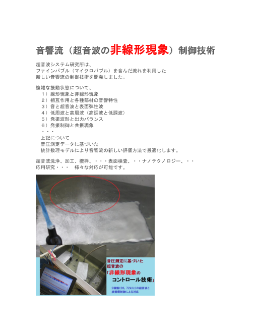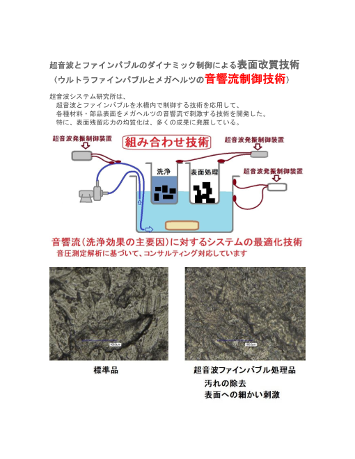 超音波システム研究所は、 超音波とファインバブルを水槽内で制御する技術を応用して、 各種材料・部品表面をメガヘルツの音響流で刺激する技術を開発した。 特に、表...