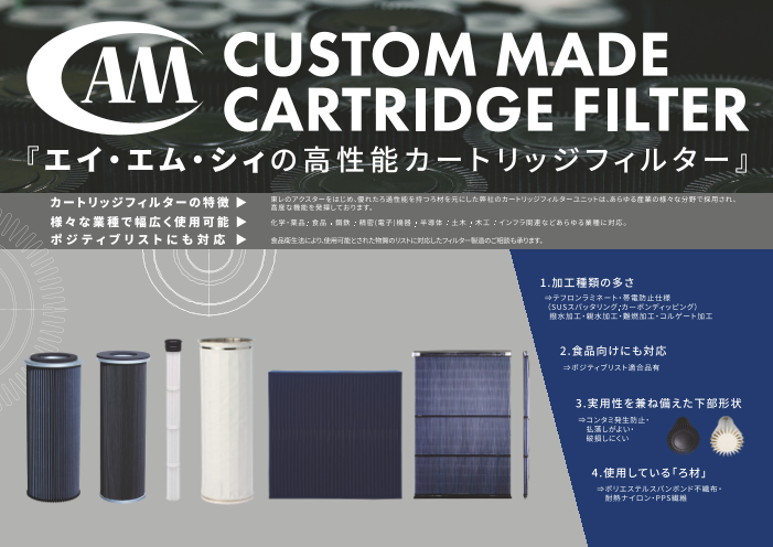 カートリッジフィルター、半導体用超精密フィルター、高温用フィルター、液体用フィルターの製造販売のエイ・エム・シィ。少量多品種・オーダーメイド対応・短納期にて工業用...