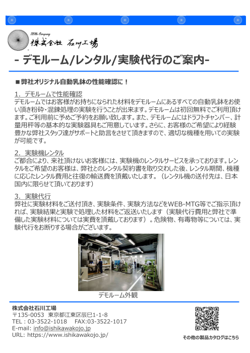 石川式撹拌擂潰機の擂潰性能をお試し頂けます。お気軽にお問合せ下さい。【デモルームのご案内】石川式撹拌擂潰機の機能、性能評価のため実験機を初回無料でご利用頂けま...
