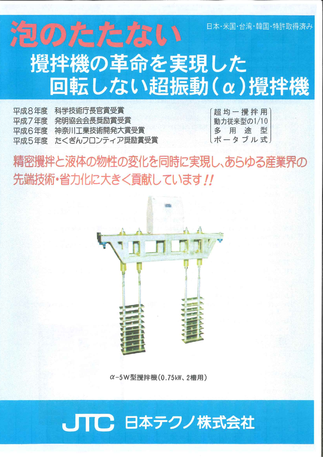 通称α-攪拌機と呼ばれていますが、原理は15~50Hzの低周波の出力で発生する振動を多段式の振動羽根(材質各種)に伝達し、その振動により発生する流体の高速三次元の乱流を基本...