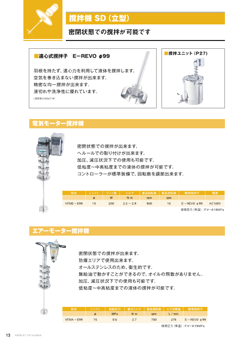 撹拌機は、ステンレス容器と組み合わせて、液体原料の撹拌、調合など様々な用途に使われています。ここでは、電気モーター式撹拌機の特長、メリット、デメリットと、エアーモ...