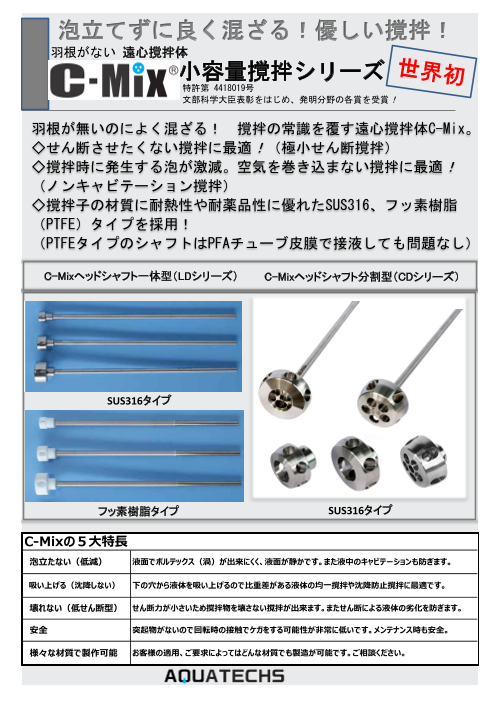 【製品特長】 ・せん断させたくない攪拌に最適! ・攪拌時に発生する泡が激減。空気を巻き込まない攪拌に最適! ・攪拌子の材質はSUS316、PTFEを採用!デモ機もご...