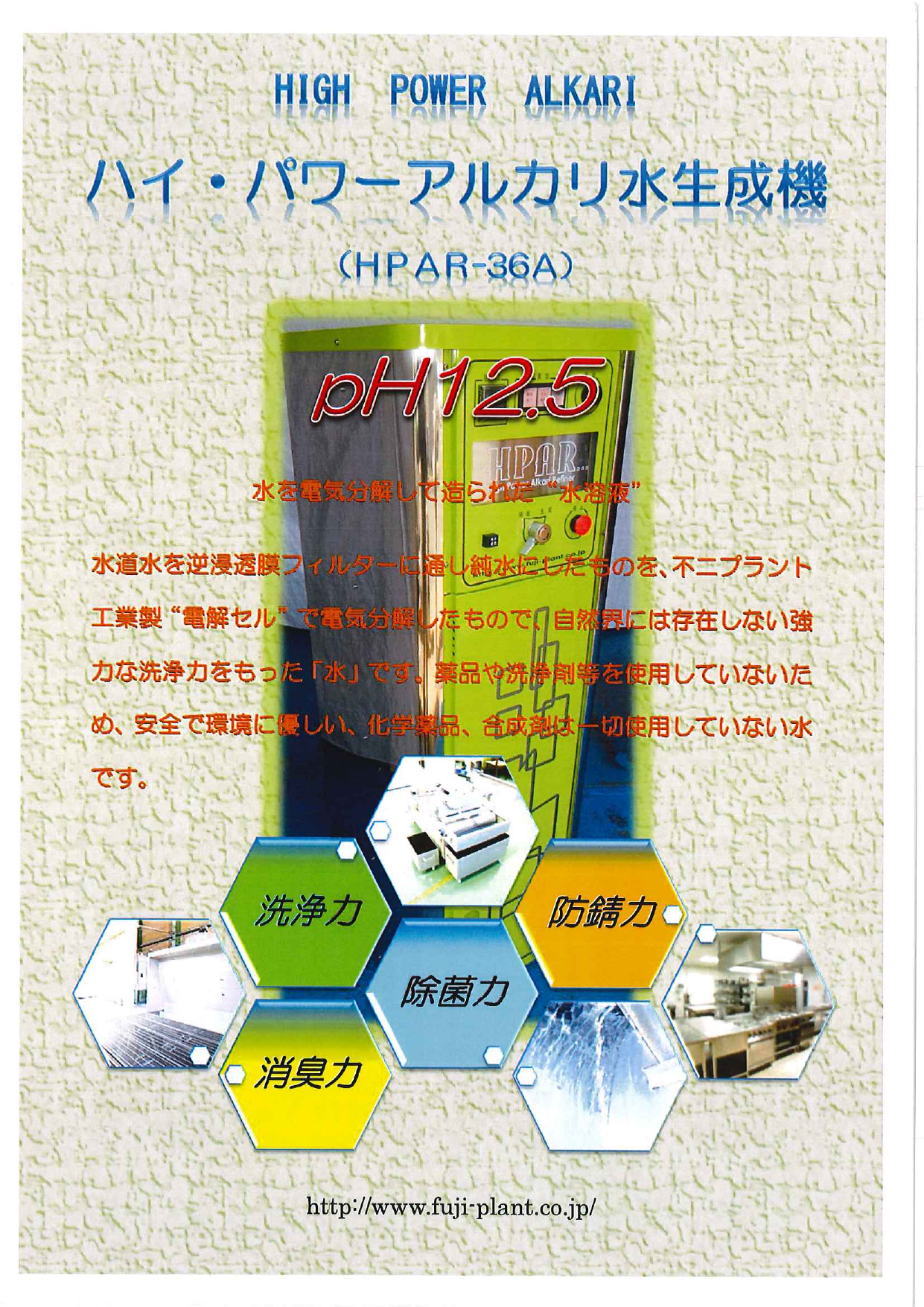 ハイ・パワーアルカリ水とは、水道水を逆浸透膜フィルターに通し純水にしたものを、不二プラント工業製”電解セル”で電機分解したもので、自然界には存在しない強力な洗浄力をも...